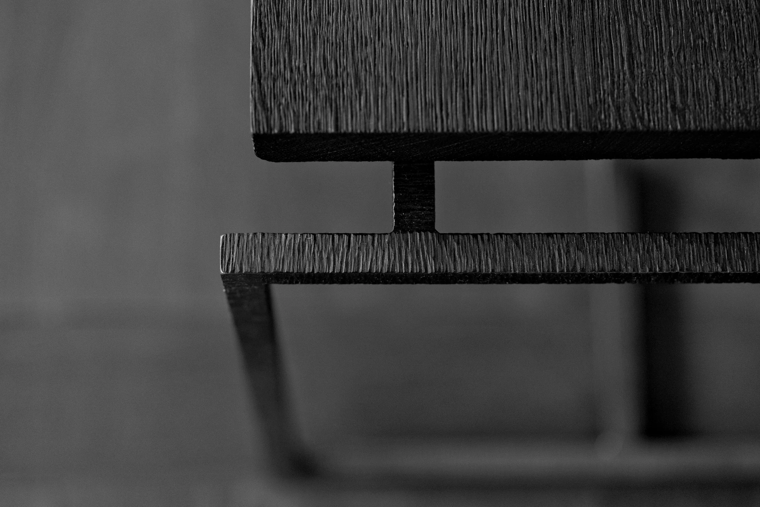 Gerd is the art of restraint. Its patinated steel frame, marked by hand-slit surfaces, reveals a subtle depth that only becomes visible upon closer look. The charred and brushed oak top feels both raw and refined – grounded, clear, uncompromisingly authentic. Gerd avoids all excess and, in doing so, gains character.